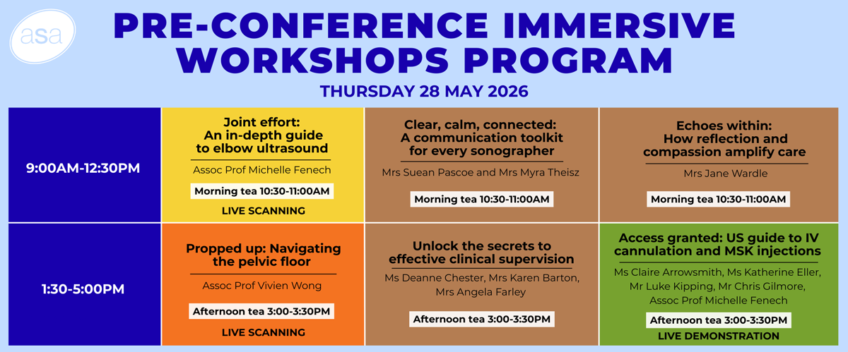 Kick off ASA2026 with a full day of immersive Pre-Conference Immersive Workshops designed to deepen clinical expertise and elevate everyday practice. Held on Thursday 28 May at the Gold Coast Convention & Exhibition Centre, these small-group sessions offer delegates rare access to expert speakers showcasing important topics for 2026. With a focus on real clinical challenges, from MSK injection techniques to pelvic floor assessment, reflective practice, supervision strategies, communication tips and advanced elbow ultrasound, each workshop delivers practical skills and insights that translate directly to care for both patients and sonographers.